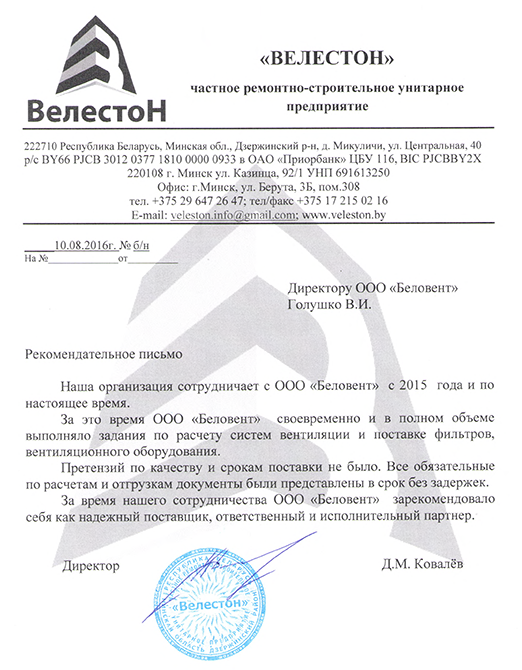 - ООО "Беловент", РБ, г. Минск, ул. Маяковского, д. 111, офис 308/1, индекс 220028